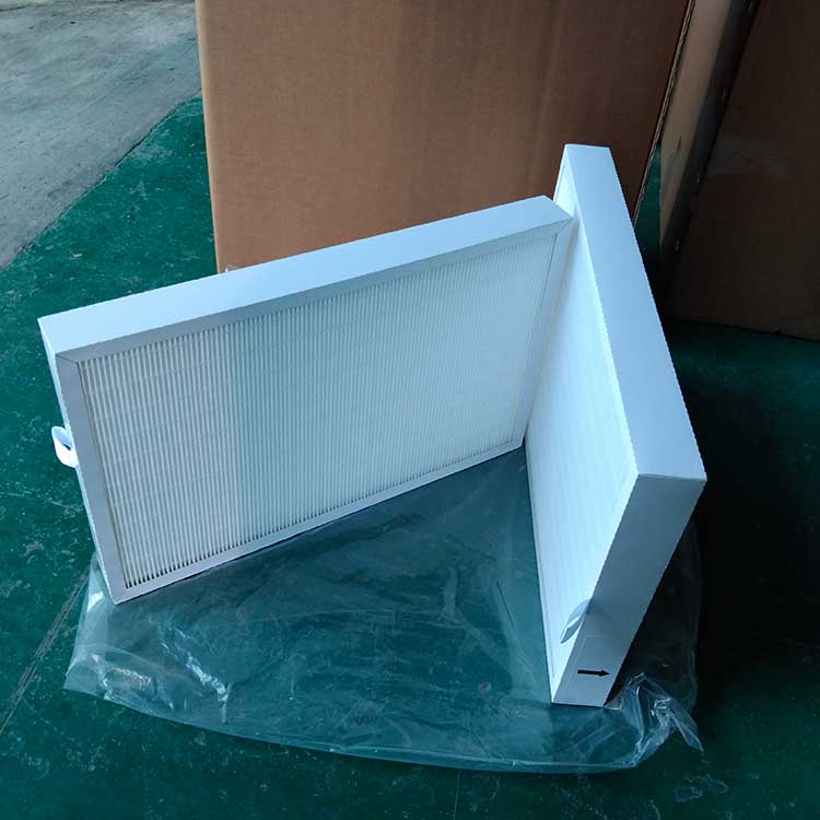 過濾材料是以折疊形式裝入高強(qiáng)度模切硬紙板內(nèi),迎風(fēng)面積增大。流入的空氣中的塵埃粒子被過濾材料有效阻擋在褶與褶之間。潔凈空氣從另一面均勻流出,因此氣流通過過濾器是平緩和均勻的。視過濾材料不同,它所阻擋的粒徑從0.5μm到5μm而不同,過濾效率也不同 。